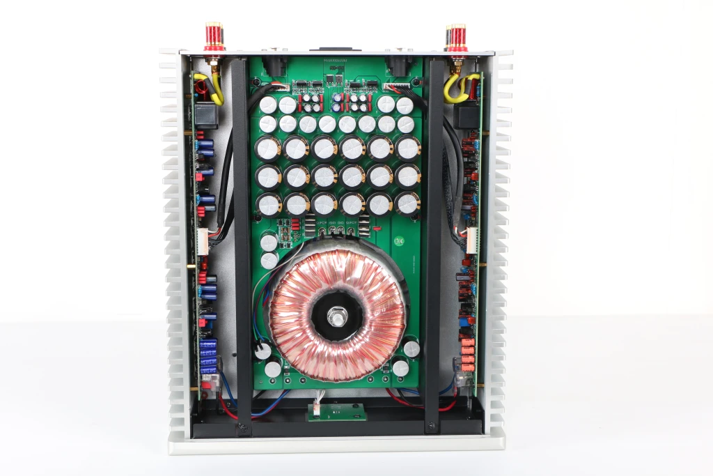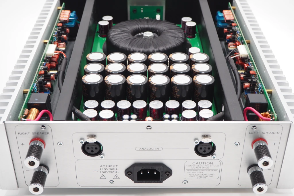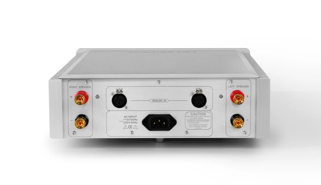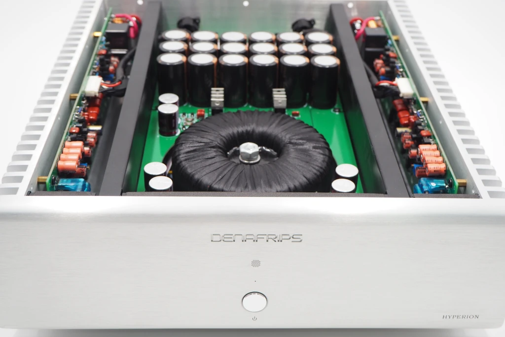 El galardonado HYPERION es un amplificador de potencia de clase AB, totalmente discreto y verdaderamente balanceado. Su potencia de salida es conservadora: 80 W por canal a 8 ohmios y 120 W a 4 ohmios (ambos canales activados, RMS). El transformador de potencia de 300 VA está hecho a medida para audio con blindaje de cobre. 18 piezas de condensadores de gran depósito (147.600 uF) y diodo Schottky de acción de conmutación rápida, que suministran rieles de alimentación de CC más que adecuados al amplificador de potencia modular. La entrada balanceada real se amplifica (tanto la señal positiva como negativa con respecto a la tierra) mediante el circuito amplificador de potencia modular. Cada canal cuenta con cuatro pares de transistores de salida. NOTA: Los amplificadores de potencia DENAFRIPS son verdaderamente balanceados. No conecte la salida de altavoz del amplificador a la entrada de alto nivel del subwoofer. Esta conexión podría dañar el amplificador. Contáctenos si necesita integrar el subwoofer al sistema estéreo.